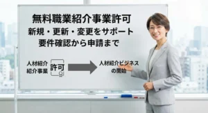 無料職業紹介事業の許可取得に必要な条件や流れを解説。登録免許税が不要で始めやすい一方、体制・事務所・責任者要件は有料と同様です。